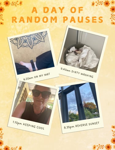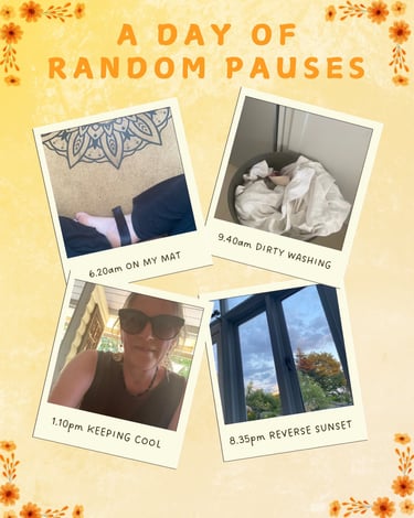 Briony’s suggestion of noticing 3 things made me realise that although I am better at slowing down these days, I am not really taking in everything around me. My first alarm at 6.20am was easy, I was on my mat, I was in a place of stillness and awareness already. There is always a magical air at that time of day too. I noticed the calm air, the morning light and few things that still needed putting away after our holiday. The second one at 9.40am amused me, I didn’t want to smell the washing and even our laundry liquid doesn’t smell of much as it is unfragranced – haha! What I noticed wasn’t so much the things around me but that we often compete chores without thinking, being on autopilot or worse still with a negative attitude. The thought of using my senses more while doing the washing did at least make me giggle! 1.10pm was lovely, lots to take in, the smells (our garden bar has a distinct smell, woody and earthy), sounds in the garden plus a coolness of being sheltered from the sun. Finally at 8.35pm, as I sat in the conservatory the light outside from the sunset reflected beautifully off the trees, the sun shining over the top of the house on to the outside. Although the air had cooled down the conservatory was still warm. An overall sense of contentment. A new habit that I adopted recently was to create some stillness before bed so this was a perfect moment. Thank you Briony for a wonderful, thought provoking challenge, love it! Below is my post showing the photos I took for my random pauses.
