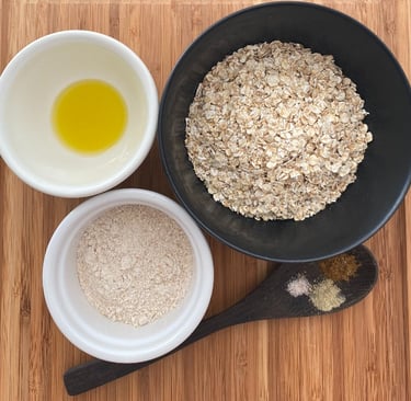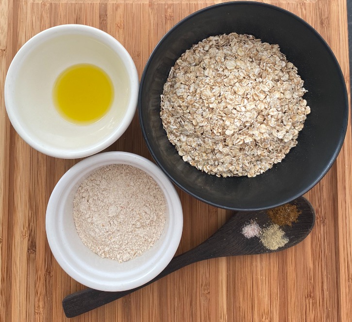 Mix all of the dry ingredients including spices and chopped nuts in a bowl. Grate in any vegetables or puree if using. Add the oil or ghee. Combine.