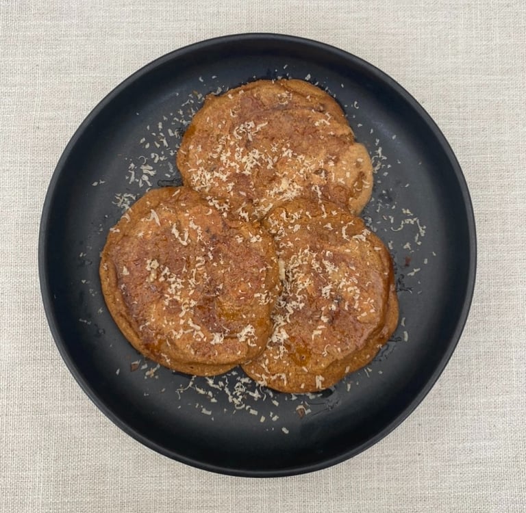 Coffee & walnut cake pancakes. Spices = 'No Caf' coffee replacement powder, carob powder, ground coriander. Add grated courgette & walnuts to the batter. Top with grated walnut & maple syrup.
