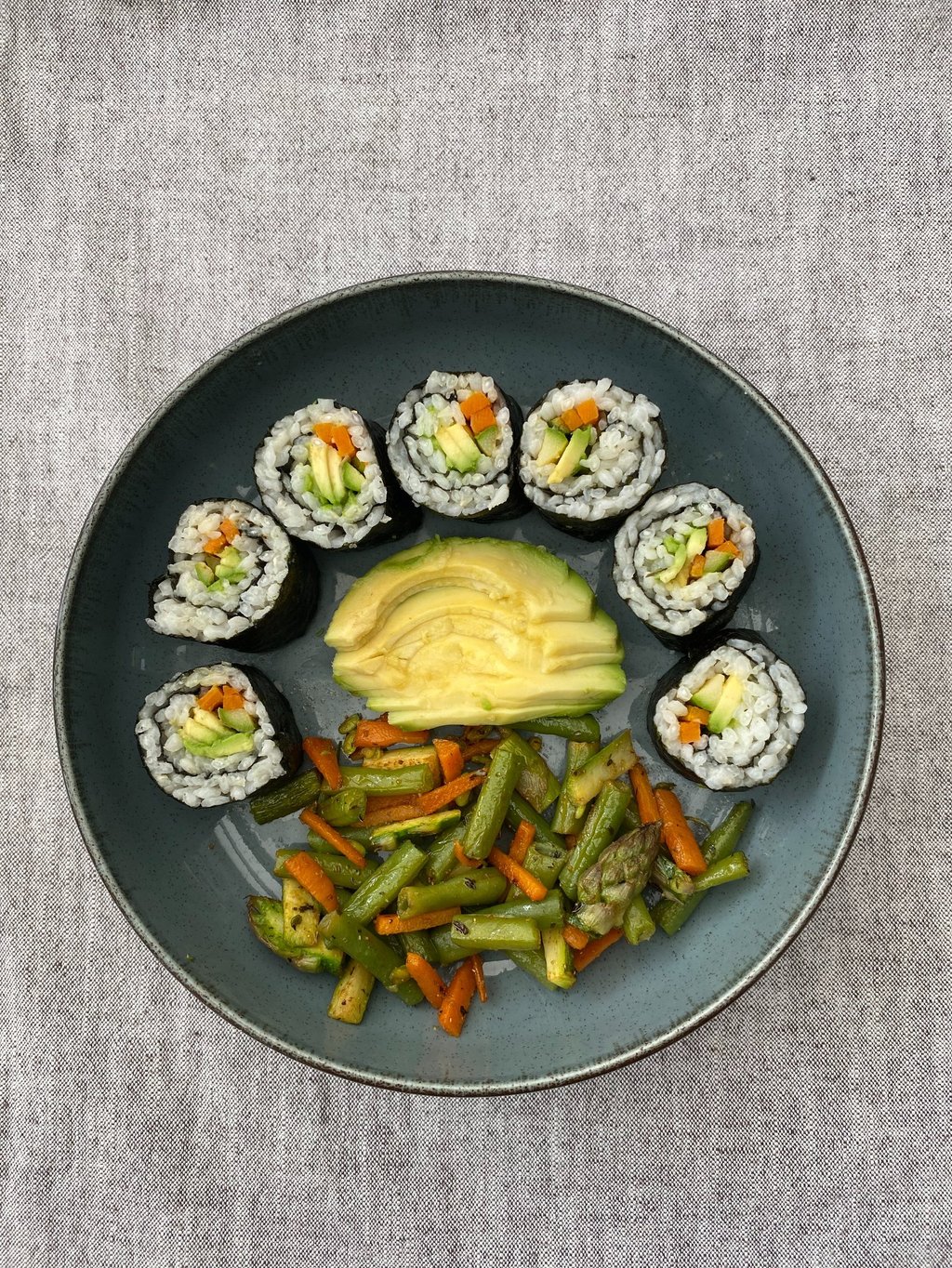 Cook the sushi rice with 1 tsp of ghee and a pinch of mineral salt. I normally use my rice cooker but a pan with a lid also works well. Using the rice cooker means I can steam the carrots and green beans at the same time, alternatively you can simply cook these gently in lidded pan with enough water to just cover the vegetables.