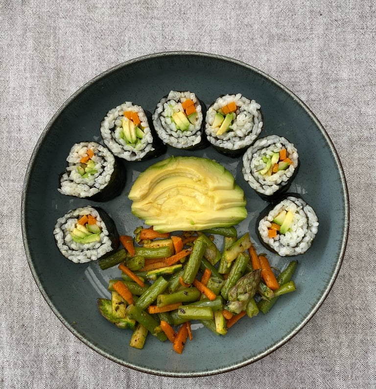 Once everything is cooked lay out the nori sheet, spread out the rice using a spatula, it will be less messy if you avoid handling the rice with your hands. Lay a strip or two of carrot and asparagus along the middle of the nori adding a layer of avocado before rolling up the edge closest to you to form a sausage shape roll.